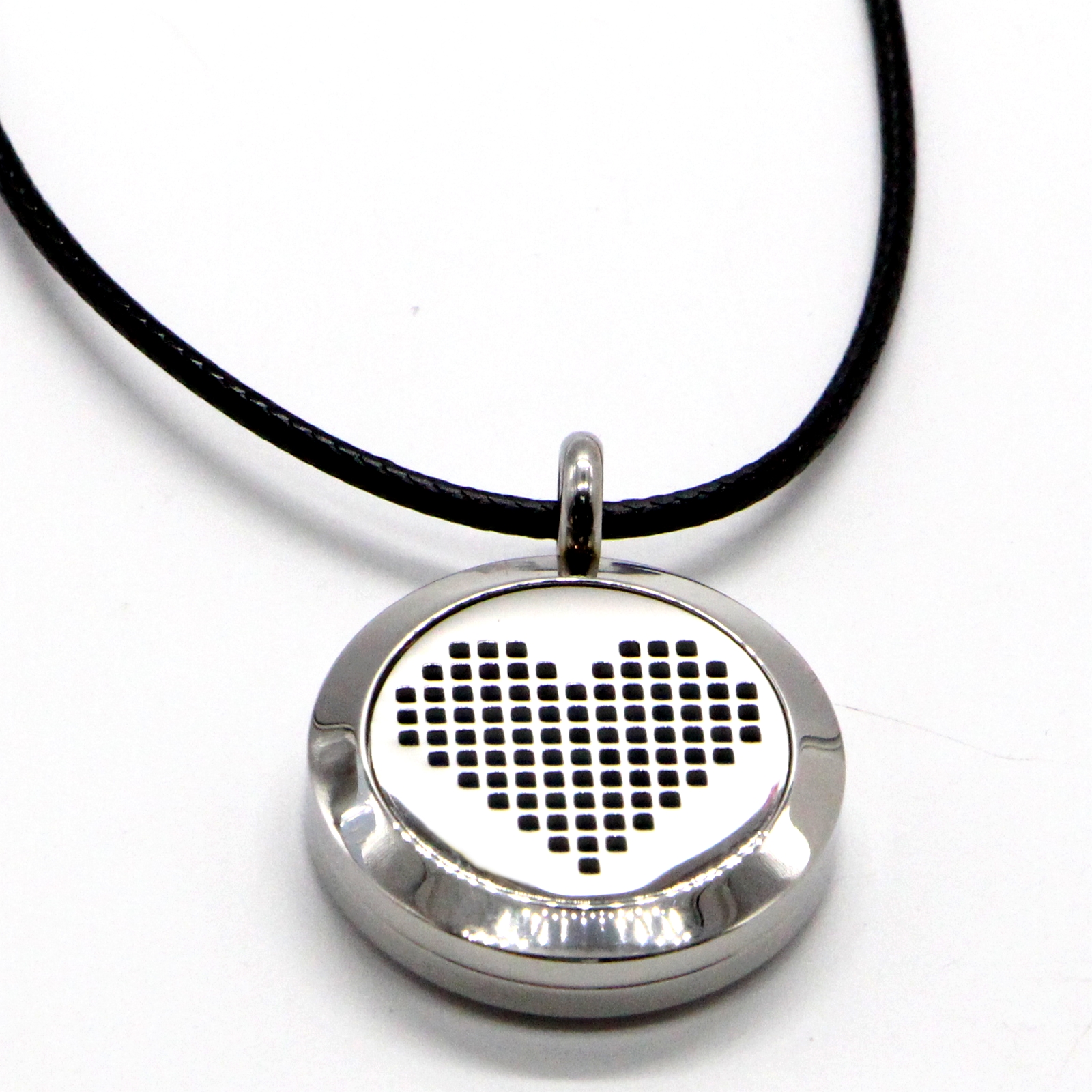 Un bijoux tendance et utile contenant 5 buvards de différentes couleurs permettant de changer d'huiles essentielles ou de senteurs facilement. Ce motif "Pixel Art Coeur" sort du commun. A offrir à l'élu(e) de son cœur ou à sa Maman chérie!